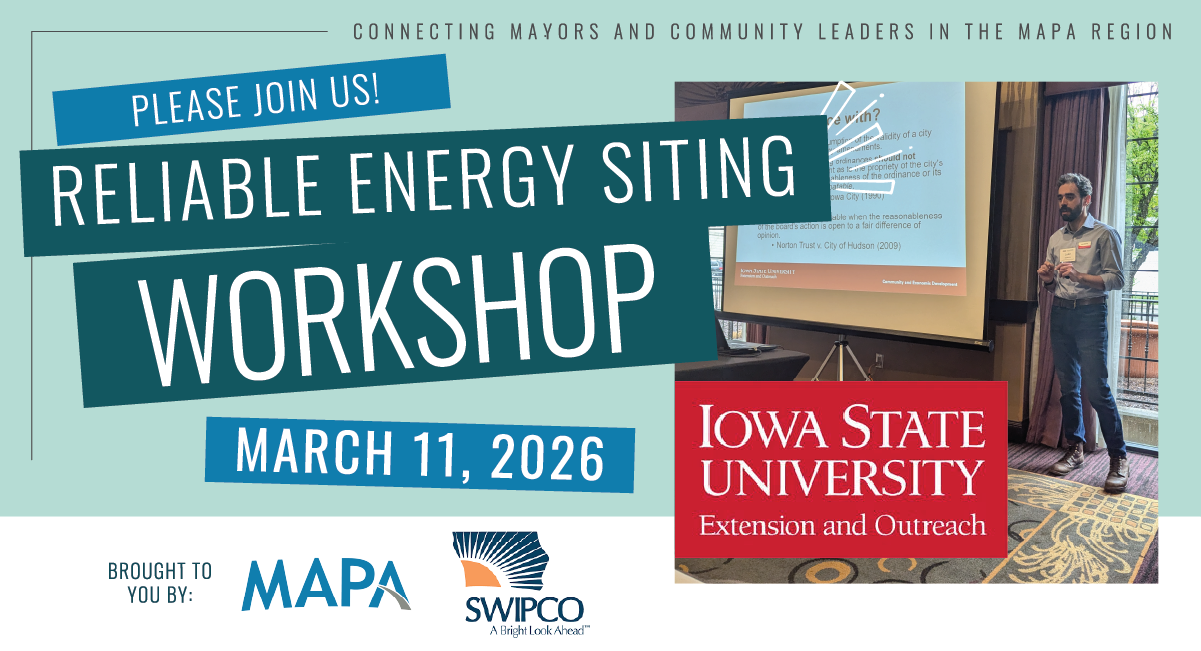 Join us after the Council of Officials business meeting for a workshop with ISU Extension Office, who is currently leading the Reliable Energy Siting through Technical Engagement and Planning (R-STEP™) project. R-STEP is a DOE-funded project that includes a number of partners putting together toolkits and strategies to support local government decision-making in Iowa.